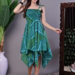 Effortlessly stylish dress with a vibrant abstract print, tie-up shoulder straps, and a chic high-low handkerchief hemline ? perfect for casual days or evening gatherings.